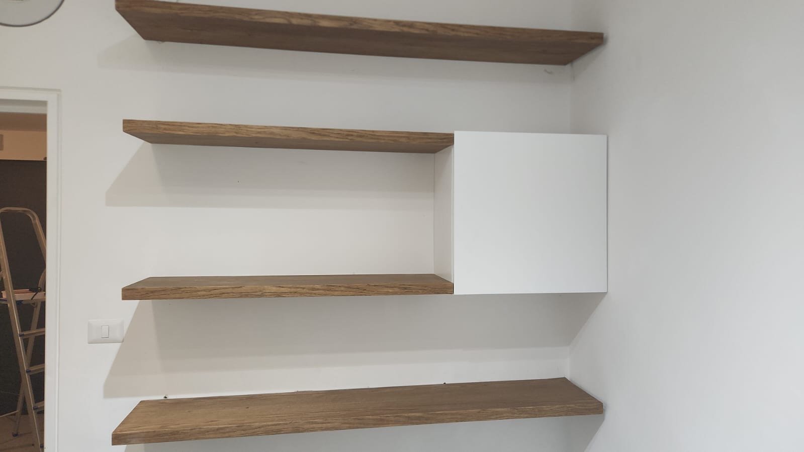 ספריית קיר דגם "קורל", משלבת ארבעה מדפי עץ מלא בגוון חום טבעי לצד יחידת אחסון לבנה סגורה. העיצוב מעניק איזון בין אחסון פתוח לדקורטיבי לבין פתרון אחסון פרקטי, ומתאים במיוחד לחללים מודרניים ומינימליסטיים.