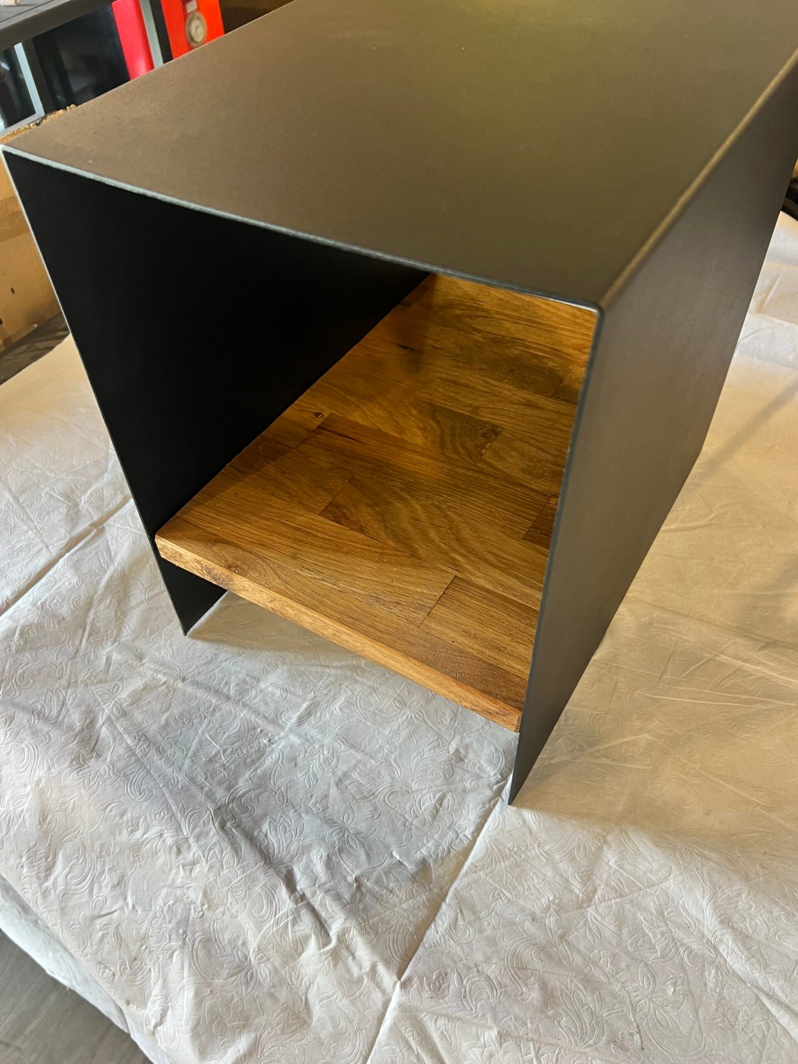 שידה מודרנית בשילוב מתכת שחורה ועץ טבעי. עיצוב מינימליסטי שמשלב חוזק ותעשייתיות עם חמימות טבעית, מתאימה לצד מיטה או כסידור בסלון.